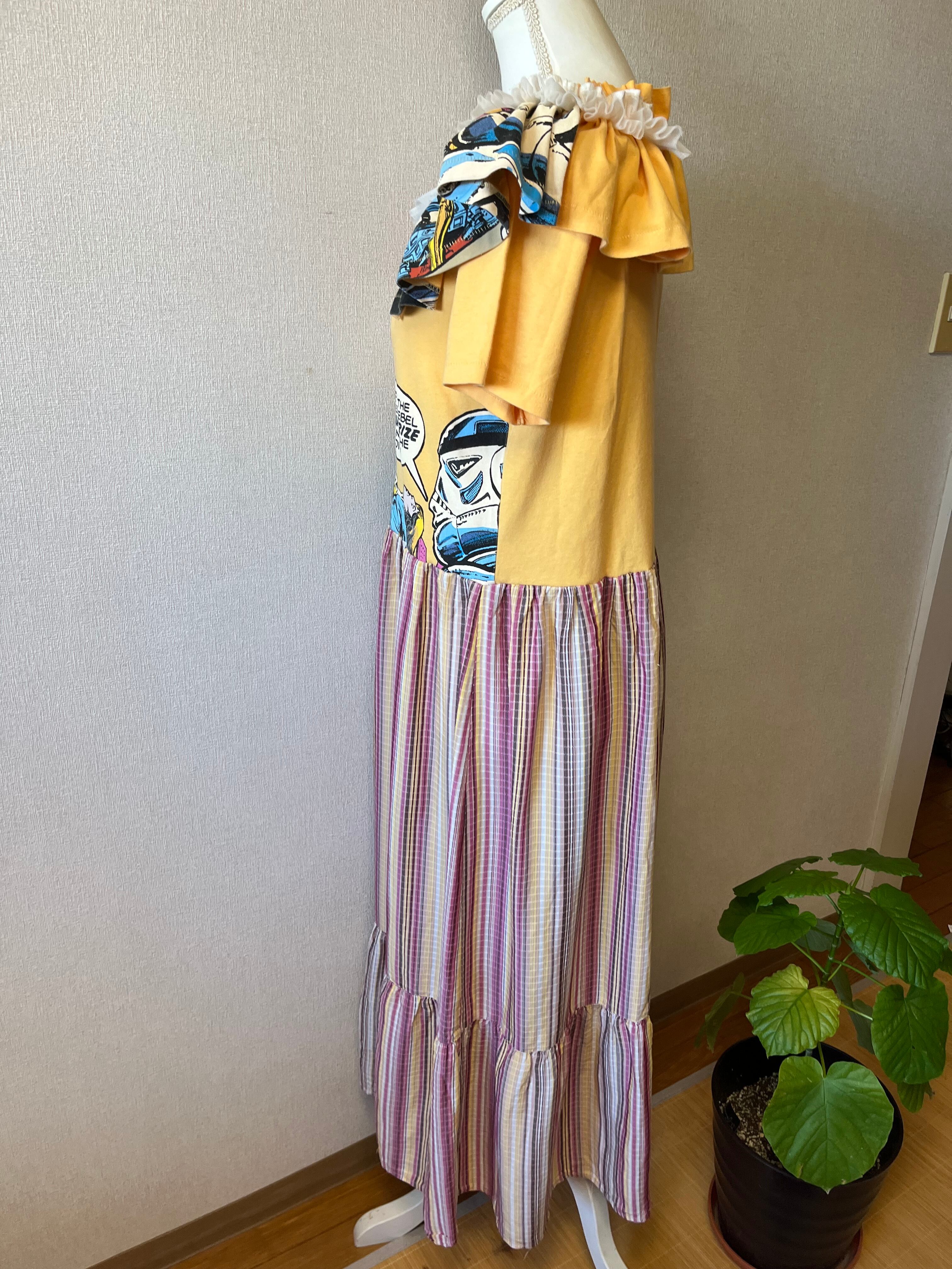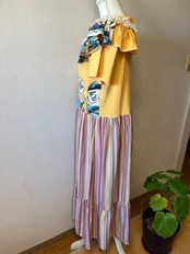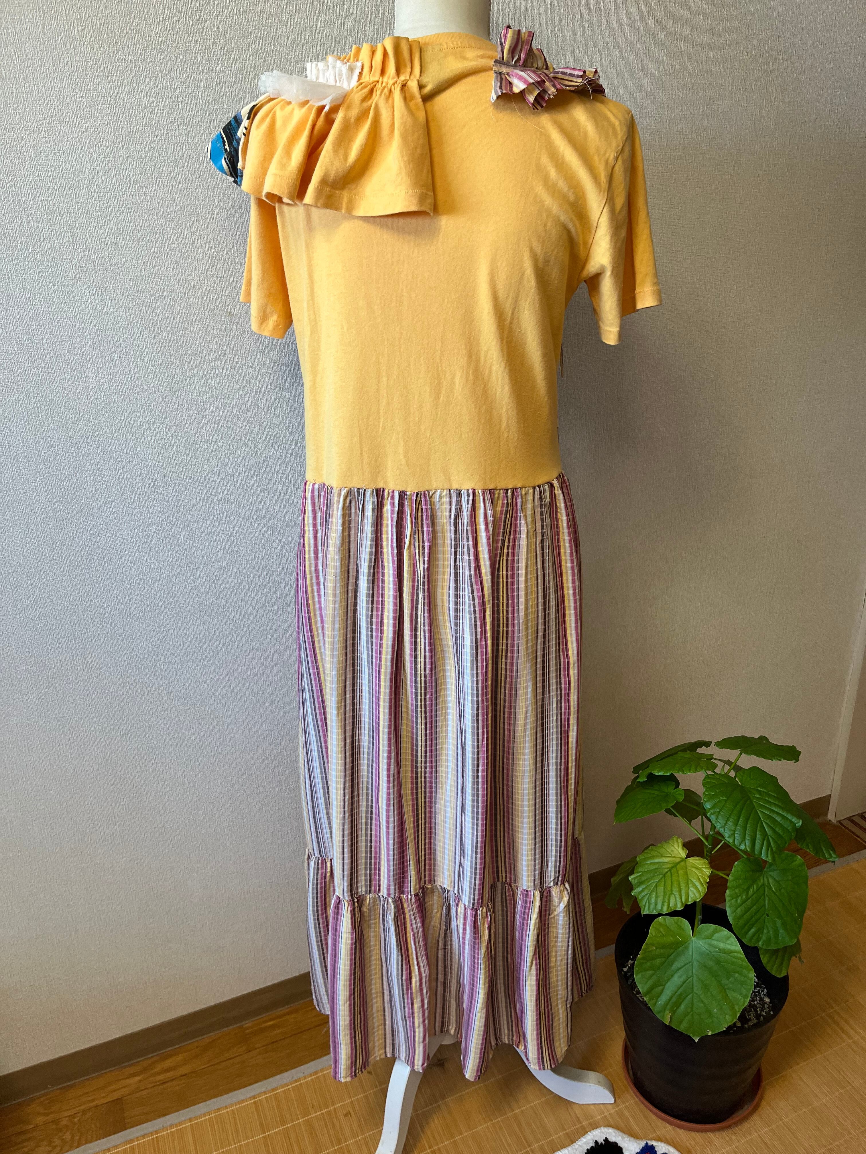 Tシャツと、オレンジ・ピンク・イエロー・ブラウンが目を惹く鮮やかなマルチストライプ柄のスカートをドッキングした、世界にひとつだけのリメイクワンピースです。