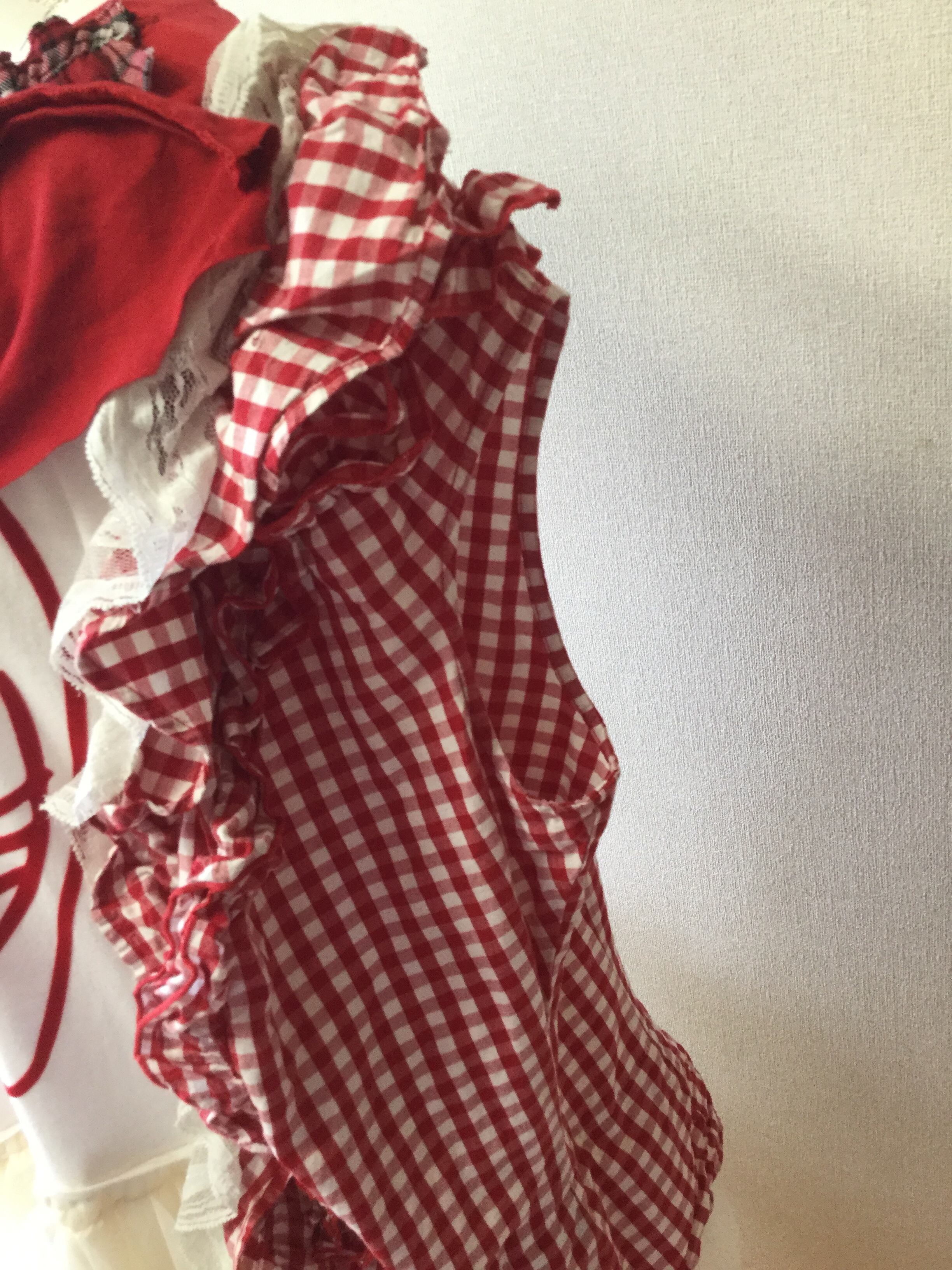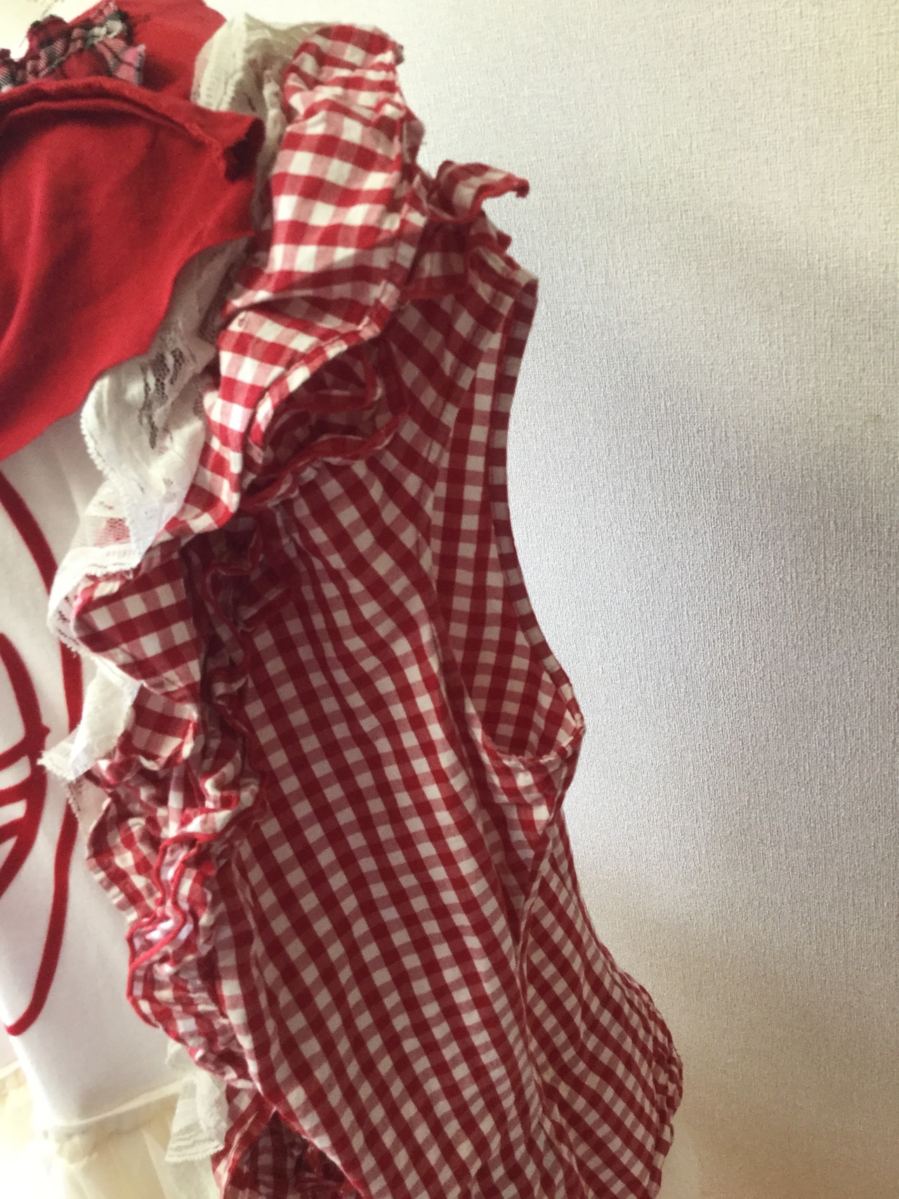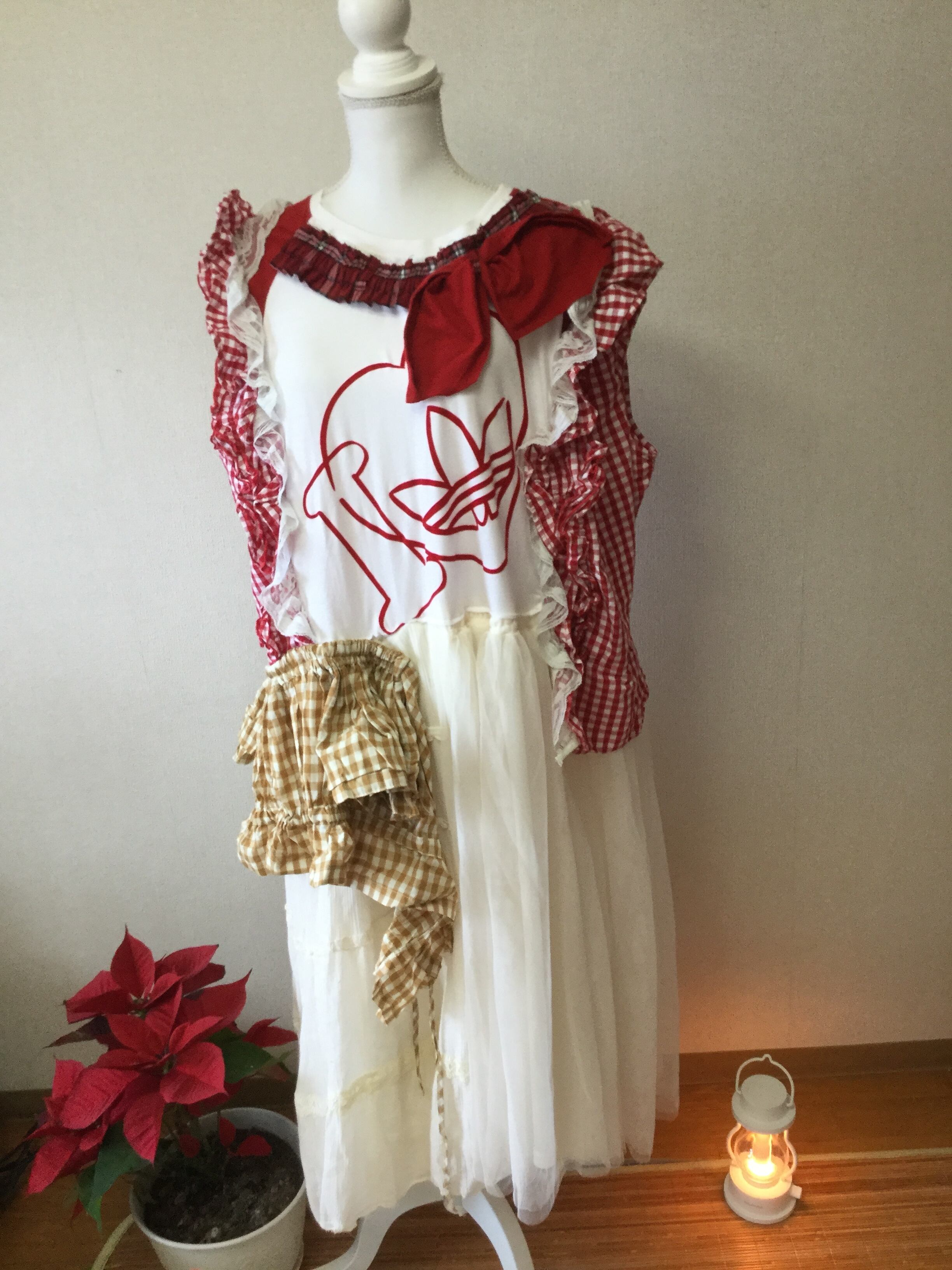 アディダスの古着Tシャツに チェックのシャツブラウスと 2種のスカートにチェックボレロを縫い付けて 春 夏に可愛いワンピースに仕上げました