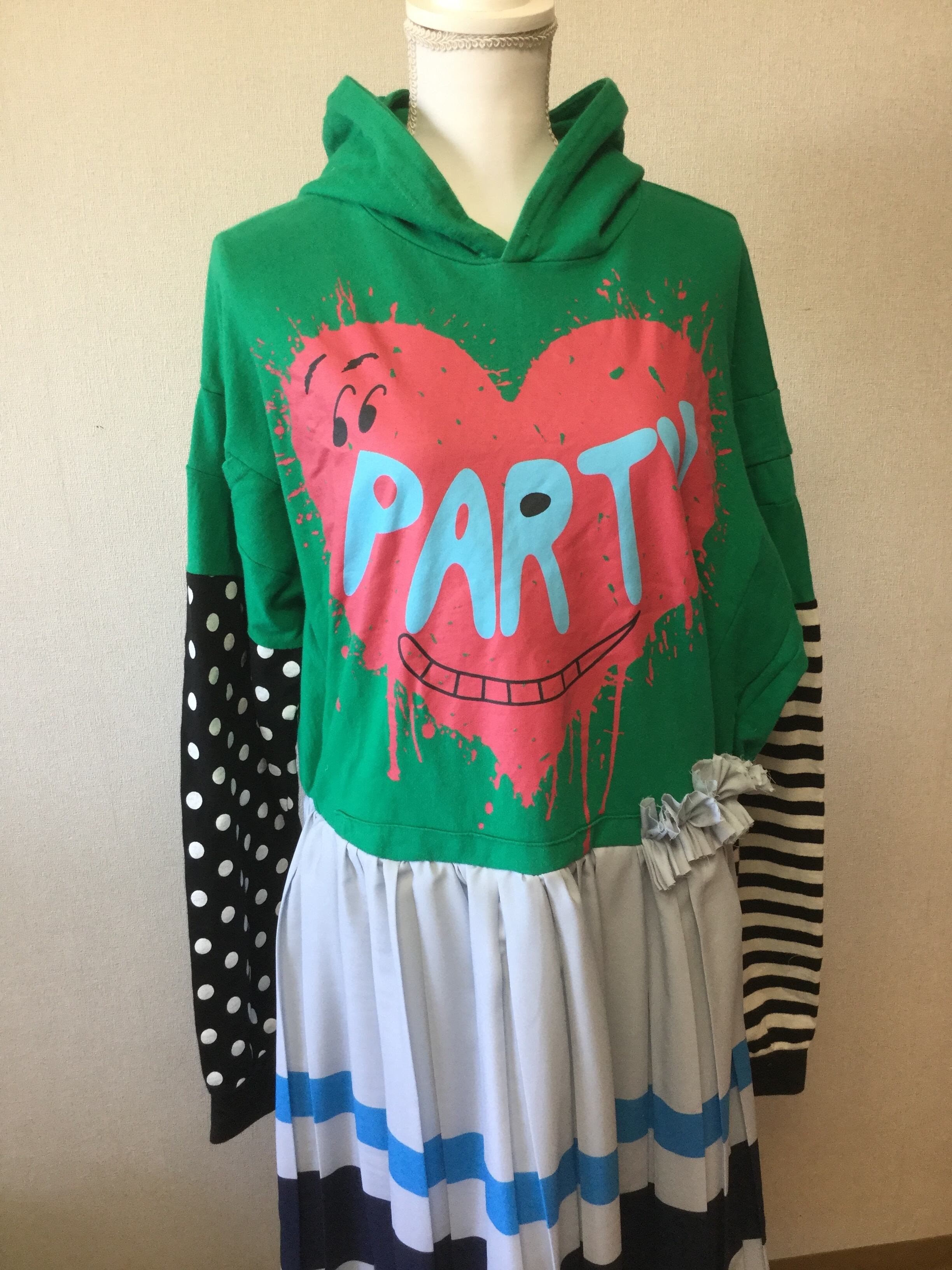グリーンのフーディ身幅を広げてブルーのラインがアクセントの柔らかなスカートをドッキング