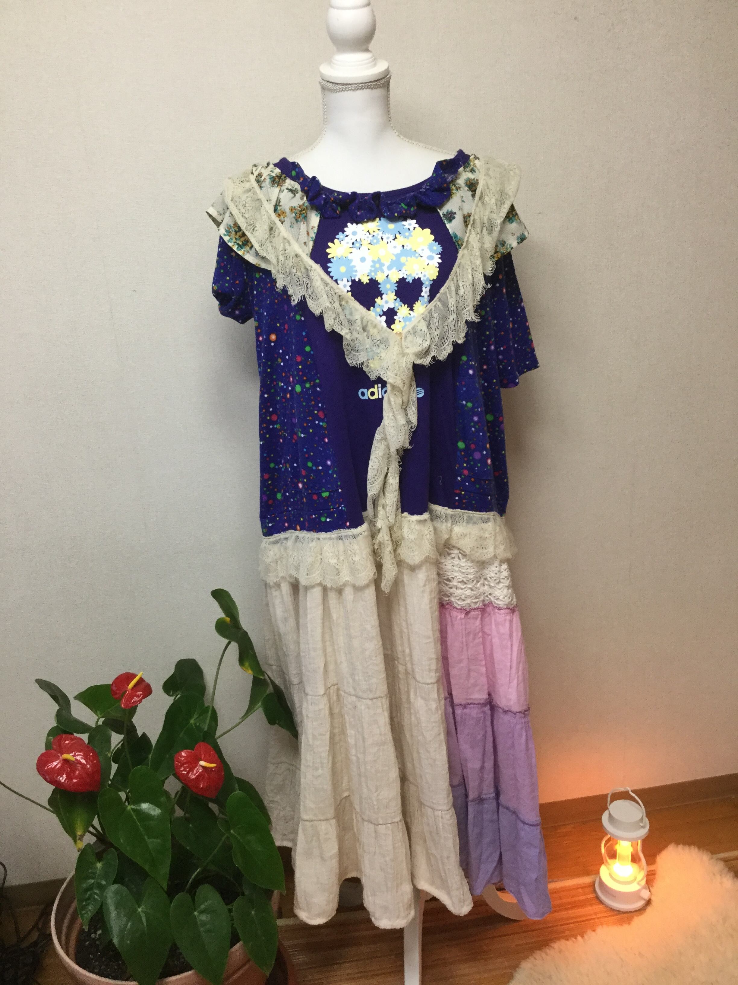 アディダスの花柄スカル模様古着Tシャツを別のプリント半袖トレーナーで身幅を広げて 胸元や首元にレース