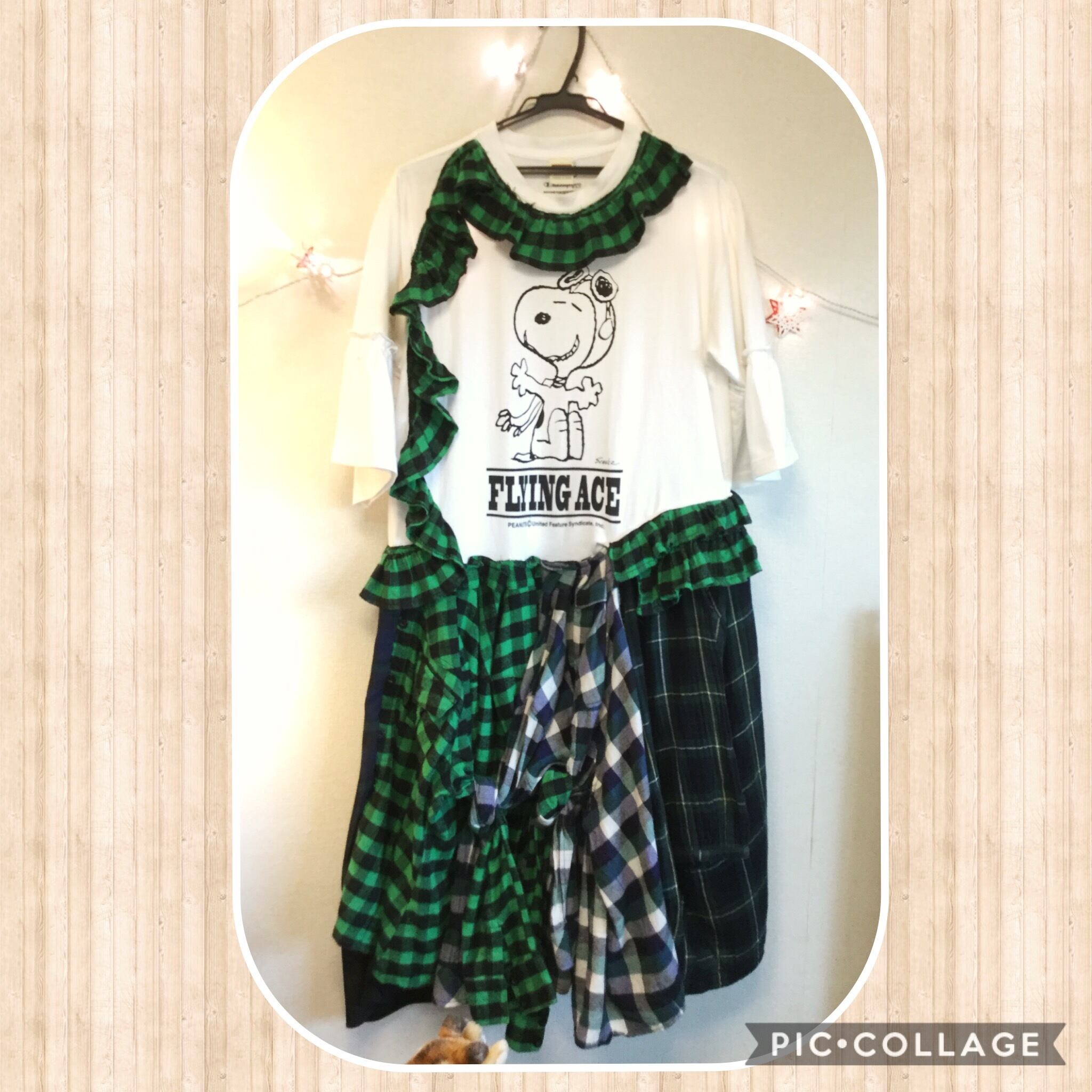 チャンピオンコラボ大きめのスヌーピーのTシャツに グリーンチェックのシャツ 4着を縫い付けワンピースに