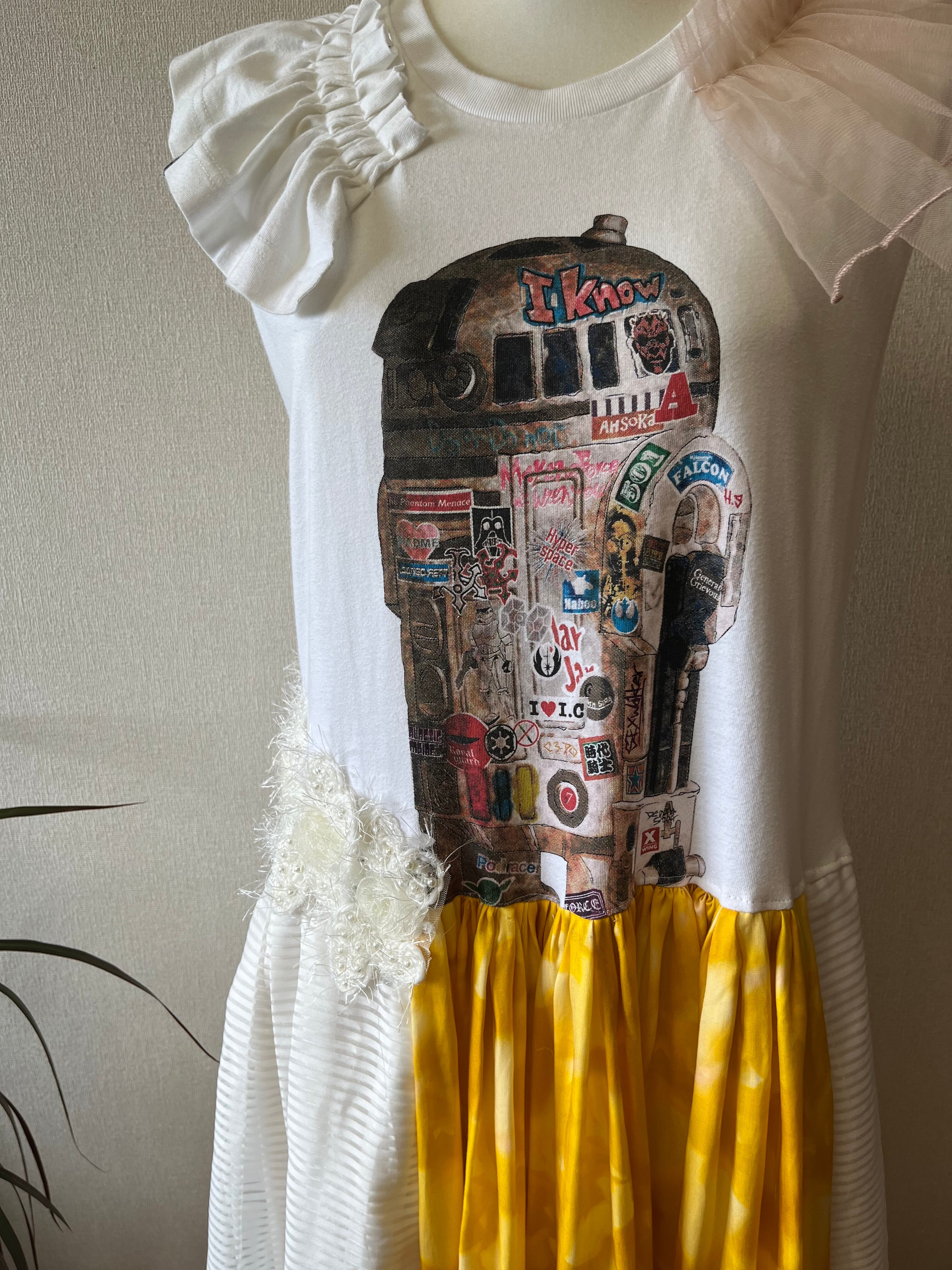 ユニークなスターウォーズTシャツをノースリーブにリメイクし、異なる2種類のスカートを組み合わせて仕立てた、一点物のワンピースです。
